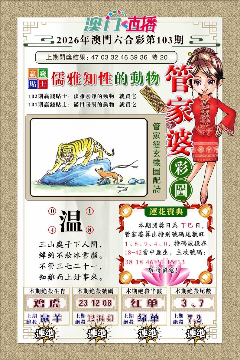 098期:今期生肖出单数,马虎狗龙牛出本期,五行土行来发财开:虎17准 |